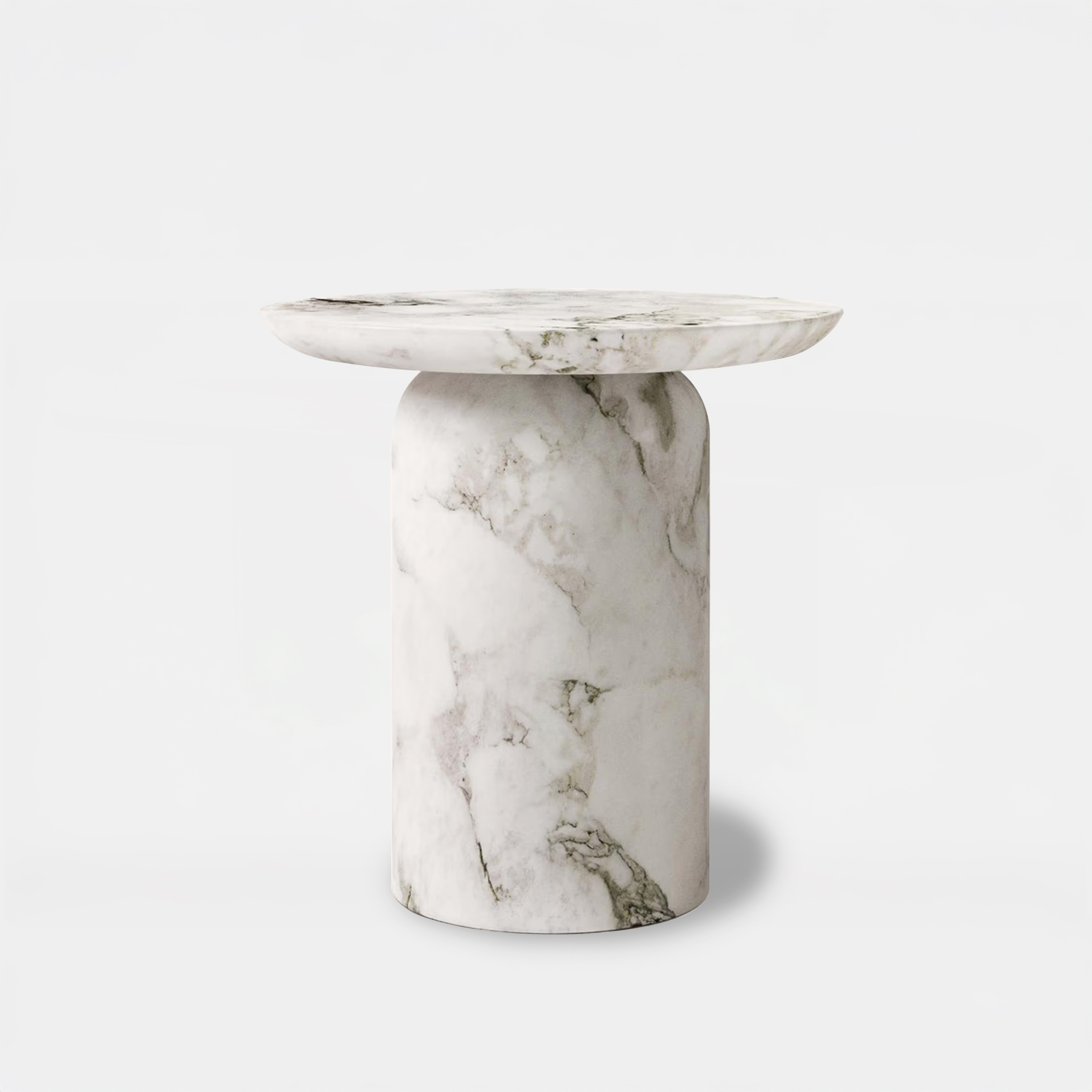 The Vesso Side Table, sculpted from Arabescato marble, highlights the stone’s striking grey veining against a luminous white base.